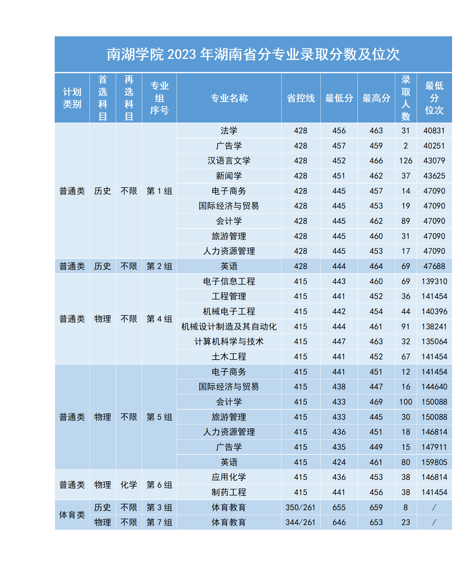 2023录取|南湖学院2023年湖南省分科分组分专业录取分数及位次